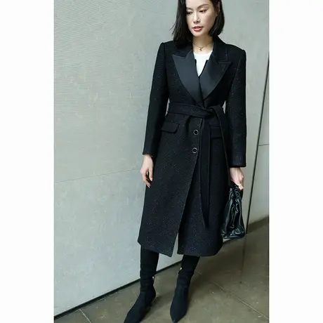 "高贵"23年秋冬新款法式气质时尚翻领拼接中长款羊毛大衣